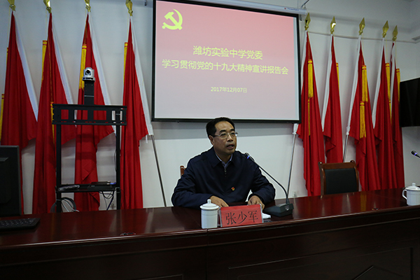 12月7日,峡山区教体局党委书记、局长张少军来我校宣讲党的十九大精神,我校党委书记、校长刘树忠以及学校全体党员参加宣讲报告会。