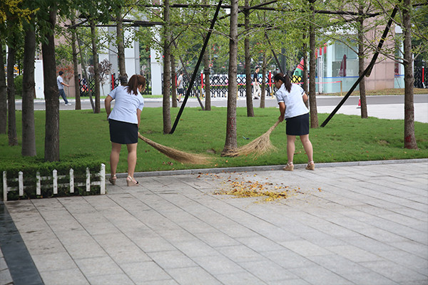 雨后清晨,老师们清理树叶,给孩子们营造整洁有序的环境